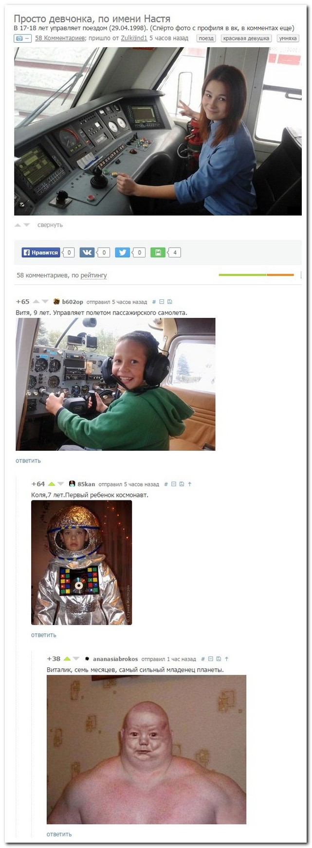 - Разведён. - И сильно развели? - Трусы-таки оставили. На приеме у гинеколога: — Девственница? — Да! — Ну, и где же ты девственница? — Это я, наверное, тампоном... — Скажи своему "тампону", что ты беременна! — Розочка! Вы уже три года, как вдова... Я тоже один... Не такой молодой, но, таки, очень небедный... Вы понимаете, на шо я намекаю? — Семен Маркович! Та я с удовольствием готова стать и Вашей вдовой! Магазин. Очередь. Молодая мама с плачущим ребенком. Попытки успокоить ни к чему не приводят. Последний аргумент: "Сейчас тебя этой тете отдам! " — с указанием на стоящую впереди тетю, мягко говоря, крупных габаритов. Тетя поворачивается: — На хер! Своих трое! После учебки приезжают в военную часть три лейтенанта, заходят к командиру части и каждый докладывает: — Товарищ полковник, лейтенант "такой-то" для прохождения воинской службы прибыл. Полковник говорит: — Так, ну с этим все понятно, но вы мне лучше ответе на три проостых вопроса. Как вы относитесь к выпивке? Как вы относитесь к женщинам? И как вы относитесь к службе в армии? Даю вам 2 часа на раздумья. Через два часа заходит первый и говорит: — Не пью, жене не изменяю, служить в армии хочу. Полковник говорит: — Молодец, будешь командиром 3й роты. Заходит второй лейтенант и докладывает: — Водку пью каждый день, жене изменяю постоянно, служить не хочу. Полковник отвечает: — Ну, тоже неплохо, будешь зав.складом. Заходит третий лейтенант и докладывает: — Товарищ полковник, водка в багажнике, девки в машине, какие будут дальнейшие указания? Полковник подходит к столу, берет трубку телефона, набирает номер и говорит: — Алло, дорогая,я сегодня немного задержусь, поеду показывать часть своему заместителю. Люся! Вы с Вадиком уехали в ночной клуб два часа назад, а у тебя до сих пор нет ни одного поста в Инстаграме. Я волнуюсь: вы туда вообще доехали?! - Заставила мужа пить таблетки успокоительного, чтобы не был таким нервным. Так он, представляешь, вычитал в инструкции, что их надо принимать три раза в день после еды. И потребовал под это дело кормить его три раза в день! - Послушай, а если кормить его три раза в день - может и таблетки успокоительные не понадобятся? - Роза Моисеевна, сколько Вам лет? - Та каждый год по-разному! — Здравствуйте, Циля, чем вы занимаетесь? — Чем таки может заниматься порядочная замужняя женщина в 10 часов вечера?! Сижу, ем — Сарочка, я решил, что больше никогда не буду с тобой ругаться! — Нет, вы посмотрите на него, он решил...А у меня ты спросил?! — Я вчера за вечер сожгла 800 килокалорий. — Ой, Роза, я тоже хочу, диктуй — я запишу! — А шо записывать? Поставила курочку в духовку и забыла! Добавлено через 23 минуты ![]() Добавлено через 51 минуту ![]() |
